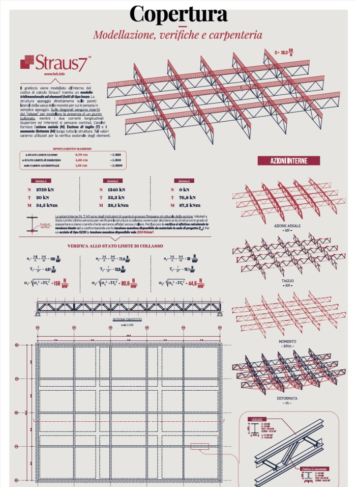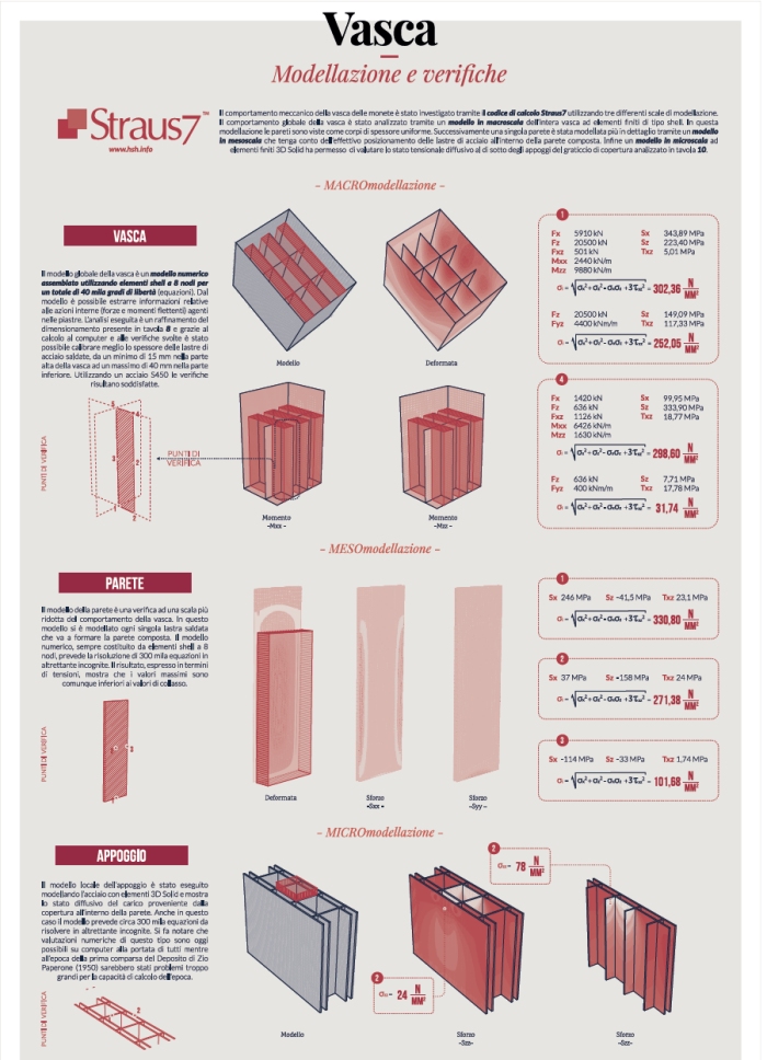 Quando nell’estate del 2013 ricevetti la telefonata dell’amico Ferdinando Zanzottera che mi chiedeva spiegazioni sul comportamento statico del Deposito di Zio Paperone, decisi immediatamente che da quel tema potevano trarsi delle lezioni per il mio prossimo corso di Teoria e Progetto di Costruzioni e Strutture al secondo anno del corso di Architettura delle Costruzioni del Politecnico di Milano. In quei giorni stavo difatti cercando l’esercitazione da affrontare e mi resi subito conto che la progettazione strutturale del Deposito di Zio Paperone era un tema accattivante per differenti motivi. Dal punto di vista ingegneristico, l’enorme spinta delle monete poneva il problema di riprogettare la vasca, in quanto la soluzione proposta nei fumetti è del tutto inadeguata ad una progettazione reale. Dal punto di vista didattico il tema si presentava molto formativo in quanto obbligava gli studenti (e il docente) ad affrontare problemi di progettazione che nessuno al mondo aveva ancora affrontato. Benché l’edificio fosse frutto di fantasia, si è quindi deciso di estrapolarlo il più possibile dal fantastico per calarlo in una situazione reale. La base di partenza è stata il progetto architettonico del Deposito, redatto da Don Rosa e pubblicato nella storia “The Beagle Boys Vs. The Money Bin” nel 2001. Esaminando tale progetto alla luce delle normative architettoniche e ingegneristiche sono apparsi evidenti molti “errori progettuali” che, benché irrilevanti in tema fumettistico, ci hanno obbligati a cercare di rivedere il progetto originario. La mancanza di un sistema strutturale portante, la mancanza di finestre nella maggior parte degli ambienti, la mancanza di norme di sicurezza, le incongruenze presenti in alcune piante (la botola scaccia intrusi scompare in un piano per ricomparire in una posizione nettamente differente) ci hanno coinvolto in una divertente operazione di riprogettazione architettonica e strutturale. Come in una situazione lavorativa reale, si è proceduto a discutere col committente (Zio Paperone) quali richieste fosse necessario soddisfare in vista di una riprogettazione degli spazi. Zio Paperone, interpretato per l’occasione dall’amico e organizzatore della presente mostra Andrea Tardito, ha richiesto la presenza di uffici il più possibile a norma, varie stanze per contenere tesori e la presenza di una botola scaccia intrusi reale e funzionante. Oltre a queste richieste si è proceduto ad operare in “parsimonia”, data la proverbiale caratteristica caratteriale a tutti nota del Papero più ricco del mondo. Ma la parsimonia non può derogare quelli che sono gli aspetti di sicurezza legati al rispetto della normativa ingegneristica, per cui si sono individuate le tipologie di carico gravanti sul deposito per poter affrontare una reale progettazione delle strutture. Da subito è apparso evidente che il carico più problematico era quello legato alla spinta delle monete e al suo contributo in ambito sismico. Problematico non tanto perché gravoso… ma perché non ben quantificabile sulla base delle conoscenze moderne. Può difatti apparire strano, ma il carico di una massa enorme di monete non è stato ancora stimato. Si è quindi reso necessario operare in aula una serie di prove sperimentali (eseguite con 5000 monete da 2 cent. di euro) per determinare i parametri ingegneristici di cui avevamo necessità per proseguire il progetto delle strutture. Definito il carico, la struttura della vasca delle monete è stata decisa tramite un’attività di “brainstorming” operata a gruppi dagli studenti che ha permesso di individuare nella soluzione “a compartimenti” l’idea progettuale più appropriata. La necessità di compartimentale la vasca delle monete è apparsa evidente dopo l’esecuzione di semplici calcoli di predimensionamento che hanno portato a spessori di pareti dell’ordine della decina di metri se pensata in calcestruzzo o dell’ordine di due metri e mezzo se pensata in acciaio fuso. La compartimentazione della vasca in vasche più piccole ha permesso di progettare le pareti della stessa come pareti composte da piatti di acciaio saldati tra loro. Soluzione realizzabile con la tecnologia attuale. L’utilizzo del software di calcolo professionale Straus7 (www.hsh.info) gentilmente fornitoci in licenza gratuita per questa esperienza didattica ci ha permesso di affinare gli spessori dei piatti in acciaio con valutazioni numeriche professionali. La parte di Deposito adibita ad uffici ha permesso di svolgere la parte di programma didattico più “standard” e mostrare agli studenti la progettazione di elementi in calcestruzzo armato (travi e pilastri) partendo dalla definizione dei carichi di normativa sino ai relativi disegni di carpenteria. Le ultime tavole dell’esposizione vedono una rappresentazione del progetto degli impianti del deposito, atti a rendere vivibili i vari spazi (acqua potabile, scarichi, aria condizionata, riscaldamento, etc.) e una rielaborazione del progetto iniziale di Don Rosa con la correzione di alcuni errori progettuali messi in evidenza nelle tavole iniziali della parte tecnica. Il lavoro svolto e presentato in questa mostra non si propone di coprire in maniera esaustiva l’intera progettazione del Deposito, difatti molti problemi architettonici e ingegneristici non sono stati deliberatamente affrontati. Fra tutti, la progettazione delle fondazioni del Deposito che, come noto, poggia su una gigantesca grotta contenente Forte Paperopoli. Introdurre anche questo aspetto avrebbe forse reso impossibile la bella esperienza didattica svoltasi nelle aule del Politecnico di Milano. Sicuramente, uno degli obiettivi principali di questo lavoro è stato mostrare come si possa collaborare all’interno dei Laboratori di Progettazione per giungere ad una progettazione efficiente sotto tutti gli aspetti Architettonici e Ingegneristici. Tema portante del corso di studi in Architettura delle Costruzioni. Voglio in 