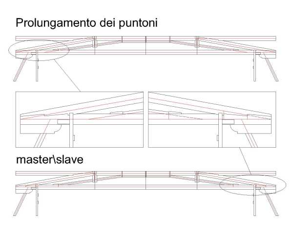Utilizzando gli elementi beam il materiale viene considerato isotropo in quanto si ha la possibilità di inserire un solo modulo di resistenza ed in particolare il modulo di elasticità medio parallelo alla fibratura (E0=11500 N/mm2). La struttura è stata modellata considerando l’asse di ogni singola asta costituente la trave ed i punti schema, che rappresentano le intersezioni di dette aste, come nodi. La trave è stata vincolata con dei carrelli sia all’intradosso, alle estremità della catena, sia all’estradosso, dove il corrente superiore penetra nel muro, mentre con delle cerniere nei diagonali che sostengono gli appoggi. Nei cosiddetti punti schema sono state introdotte delle cerniere interne. In questa analisi semplificata si è tralasciata la presenza degli elementi in ferro che collegano la parte superiore della struttura con la catena e dei ritti provenienti dagli ambienti sottostanti non costituendo un appoggio per la catena in quanto non sono ad essa collegata. Si sono utilizzati due differenti schemi (fig 10) per la rappresentazione con gli elementi beam, per cercare di modellare al meglio i nodi puntoni-catena. Il primo consiste nel considerare semplicemente il prolungamento dell’asse dei puntoni sino ad incontrare l’asse della catena. Il secondo invece, utilizza dei particolari elementi detti master/slave che collegano due punti, uno sul puntone e uno sulla catena. A loro volta questi link si sono utilizzati in due differenti modalità: una prima nella quale vengono vincolati solo gli spostamenti traslazionali dei due punti collegati con il link ed una seconda nella quale si vincolano gli spostamenti ed anche le rotazioni relative attorno all’asse perpendicolare al piano della trave, per simulare la staffa di contenimento.