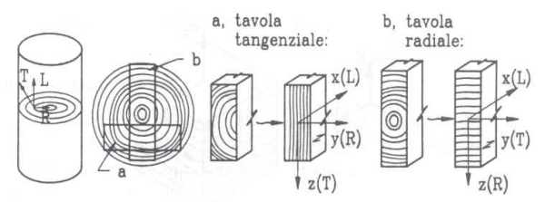 In ogni punto della sezione retta di un tronco (sezione normale all’asse dell’albero) si può individuare oltre alla direzione parallela all’asse dell’albero in quel punto (direzione longitudinale L, normale al piano della sezione), una direzione tangente all’anello di accrescimento annuale in quel punto (dir. tangenziale), ed una direzione normale alla direzione tangenziale nel punto (direzione radiale R): tali direzioni costituiscono le tre direzioni di ortotropia (fig 13).