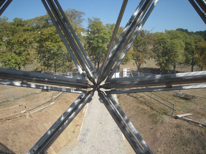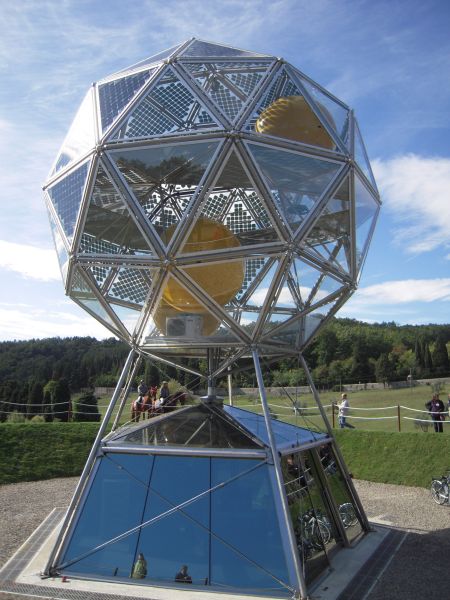1. Breve descrizione - Diamante è il nome attribuito ad un prototipo di mini-centrale elettrica nella quale l’energia radiante solare viene trasformata in energia elettrica per mezzo di pannelli fotovoltaici opportunamente disposti sulla superficie di una sfera reticolare in acciaio posta ad una certa altezza dal suolo. La centrale ha la peculiarita', rispetto a un normale impianto fotovoltaico, di immagazzinare l'energia in appositi serbatoi sotto forma di ioni di idrogeno che alimentano batterie al litio. La sfera geodetica misura 4,0 m di raggio ed il suo centro è sostenuto a 7,63 m di altezza dal piano di imposta da una struttura reticolare sottostante all’interno della quale è situata la sala apparati. La sfera è formata da aste in acciaio inossidabile AISI 316L, di sezione circolare CHS 101.6x4 e lunghezza rispettivamente 2,472 m e 2,186 m, e da nodi sferici pieni di diametro 132 mm, in acciaio AISI 303. L’involucro del Diamante è costituito da 80 pannelli in vetro alloggiati nelle maglie triangolari del reticolo strutturale, di questi 38 saranno utilizzati per la produzione di energia mediante l’inserimento di celle fotovoltaiche nel materiale di interfaccia. Ciascun pannello è costituito da due lastre di vetro stratificato extralucido temperato chimicamente e spesso 10+6 mm, con interposto uno strato di PVB (polivinilbutirrale) di 1,52 mm di spessore. |