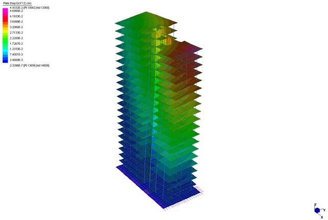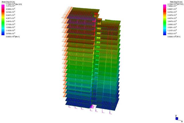 nella figura che segue sono riportati gli spostamenti massimi sotto il vento in direzione “X”, pari a 8 cm circa (H/875):