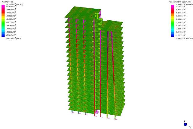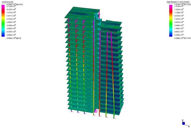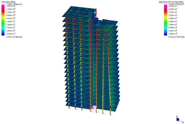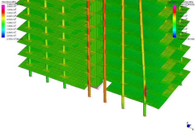 I solai sono stati modellati con elementi isoparametrici a 8 nodi a comportamento di piastra, così come i setti degli ascensori, tutti con gli effettivi spessori, opportunamente infittiti in corrispondenza di discontinuità di carico e di vincolo.