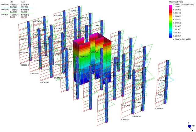 La platea è divisa in giunti, che rispettano la divisione della torre superiore con gli edifici adiacenti bassi e concetti di ottimizzazione della distribuzione delle pressioni sul terreno.