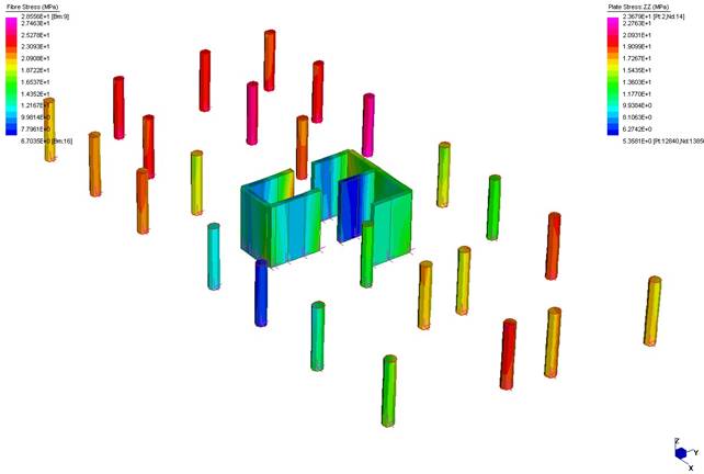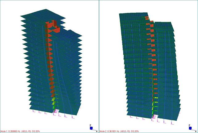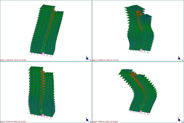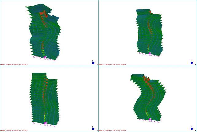 Il modello della torre è stato anche analizzato nel suo insieme con analisi della frequenza, per cercare le frequenze proprie di vibrazione.