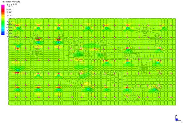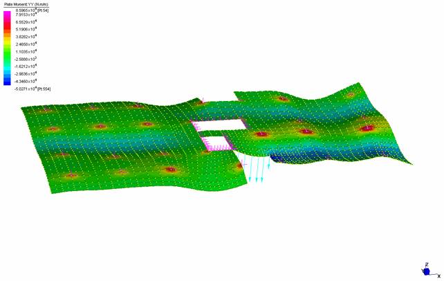 Per questo la platea è stata modellata con elementi finiti shell con supporto dovuto al terreno con Kw=100 Mpa/m (10 kg/cm3).