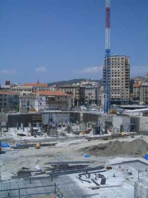 situazione straordinaria, lungo vico del molo, lato lungo il quale si dovranno realizzare due tiranti ogni pannello, inclinati di 14° (25%) sulla verticale, tirati a 96 tonnellate l’uno (8 trefoli), lunghi 30 metri di cui 8 connessi (bulbo). In questo modo i tiranti fuoriescono di 6 metri dal perimetro del diaframma e restano sotto il suolo pubblico, senza andare sotto gli edifici privati.