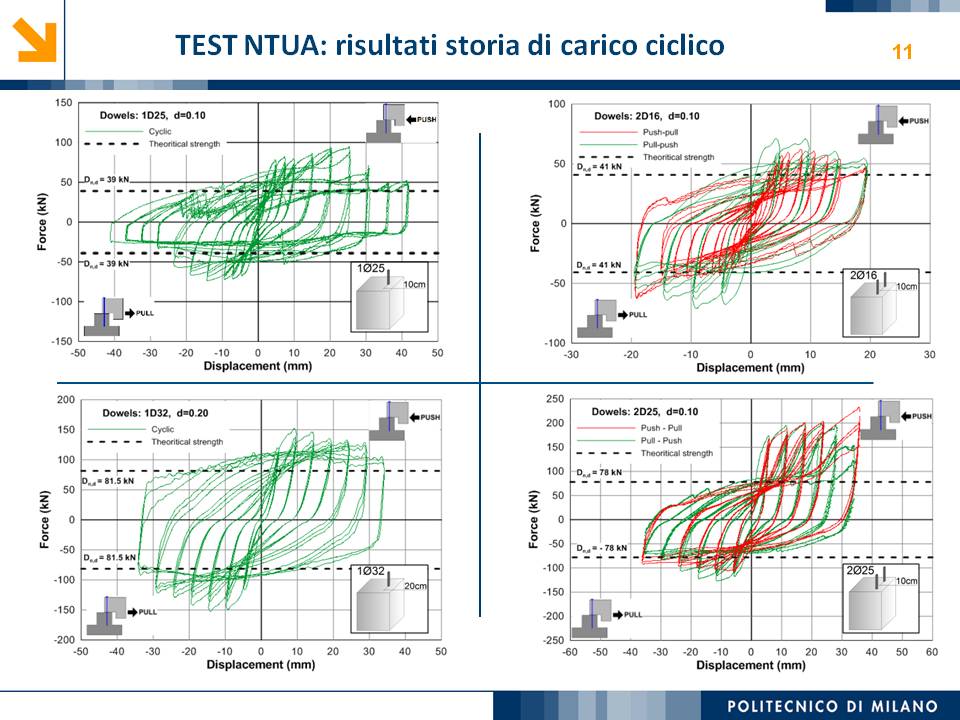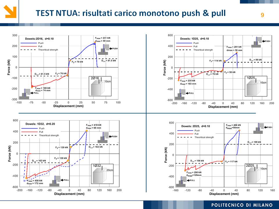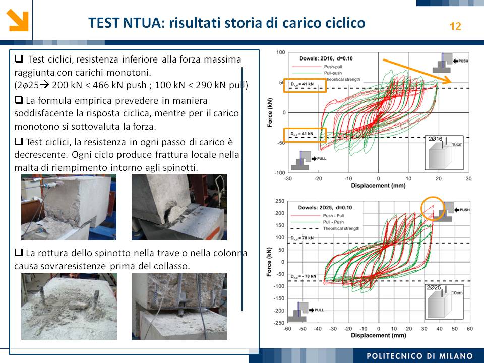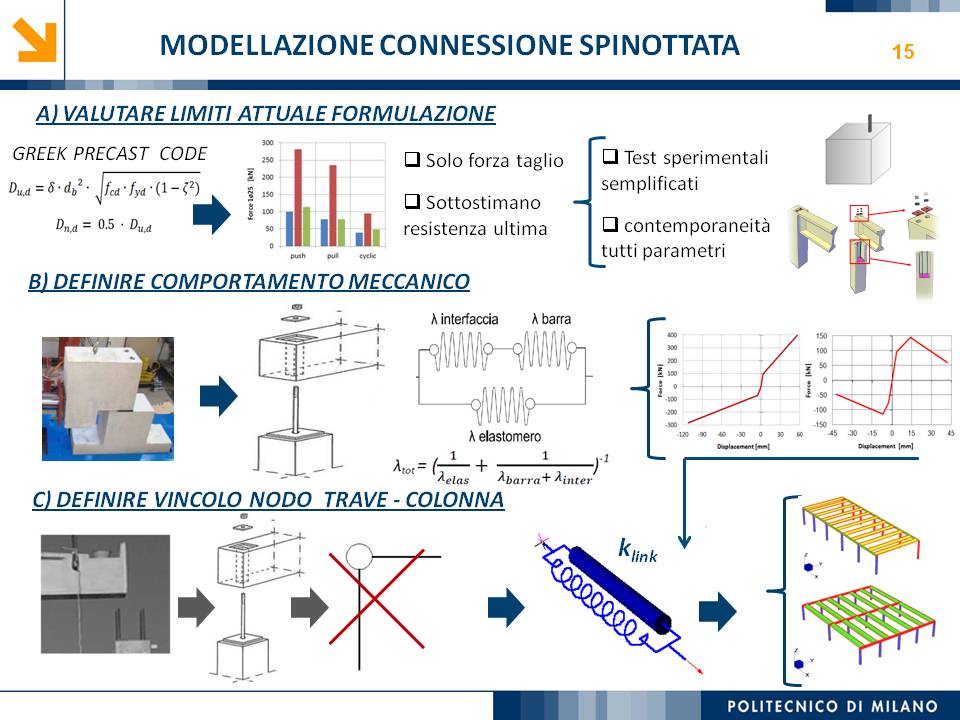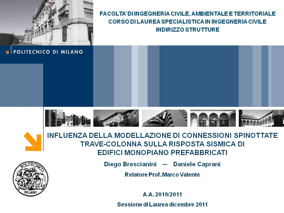 L’obiettivo dello studio presentato è qualificare e quantificare i parametri caratteristici del comportamento sismico, in termini di spostamento, resistenza, rigidezza e duttilità, delle connessioni a spinotto trave – colonna correntemente impiegate nelle strutture industriali prefabbricate. Queste connessioni sono tipicamente costituite da barre di acciaio ancorate nel pilastro e passanti in appositi alloggiamenti della trave, successivamente annegati con malta, in modo da garantire un comportamento pressoché a cerniera nel piano verticale e un comportamento rigido nel piano orizzontale. Nella tesi è riportata un’analisi parametrica relativa alle formulazioni attualmente presenti in letteratura per la valutazione della resistenza di tali connessioni, al fine di sottolineare pregi e difetti di ognuna. Viene inoltre presentata la procedura necessaria a caratterizzare il comportamento del collegamento in termini di forza-spostamento, sia a snervamento sia a rottura, mediante curva “Bi-Lineare” e “Tri-Lineare”. Tali procedure sono verificate attraverso una campagna sperimentale, realizzata nell’ambito del progetto di ricerca Europeo SAFECAST, di cui si riportano i set up delle prove e i risultati ottenuti per storie di carico sia monotono sia ciclico; i test sono stati condotti fino allo spostamento ultimo, in modo da determinare, in maniera dettagliata, la curva forza-spostamento caratterizzante la connessione. La definizione “Bi-Lineare” e “Tri-lineare” del comportamento del collegamento spinottato è stata applicata nella modellazione ad elementi finiti di due strutture prefabbricate monopiano ad uso industriale, simmetrica e non, realmente esistenti. Su tali strutture sono state condotte analisi dinamiche non lineari, Time History, al fine di evidenziare la differente risposta, da parte dell’edificio soggetto a sisma, tra l’innovativa modellazione della connessione spinottata con elementi “Beam Spring” e il classico vincolo a semplice cerniera, attualmente adottato nella comune pratica progettuale. Lo studio presentato cerca di colmare le lacune nella conoscenza del comportamento sismico delle connessioni spinottate trave-colonna, promuovendo lo sviluppo di strumenti numerici appropriati, attendibili e verificati sperimentalmente, da utilizzare nella progettazione di strutture prefabbricate in zone sismica sfruttando le proprietà delle stesse connessioni. Il software utilizzato per le modellazioni FEM e' il codice di calcolo Straus7. |