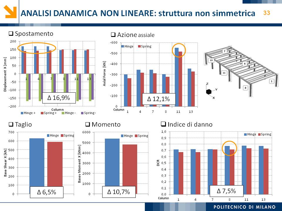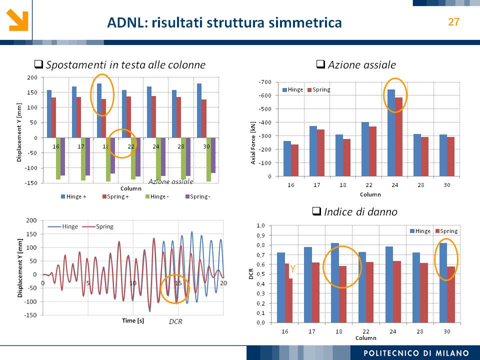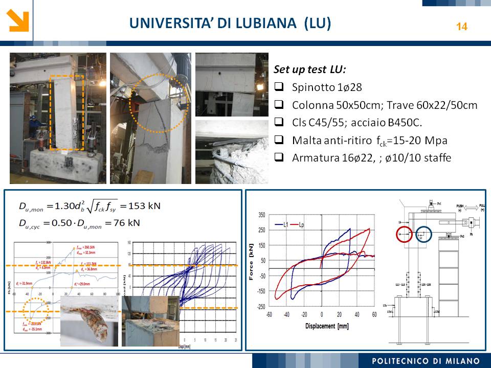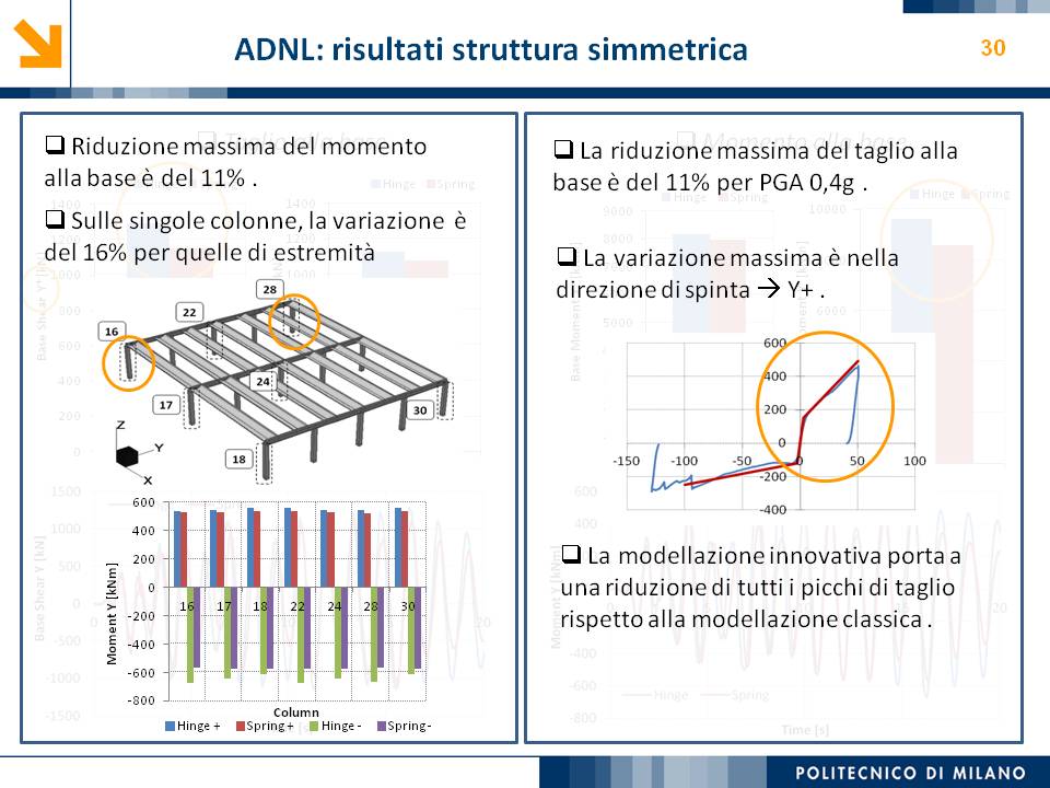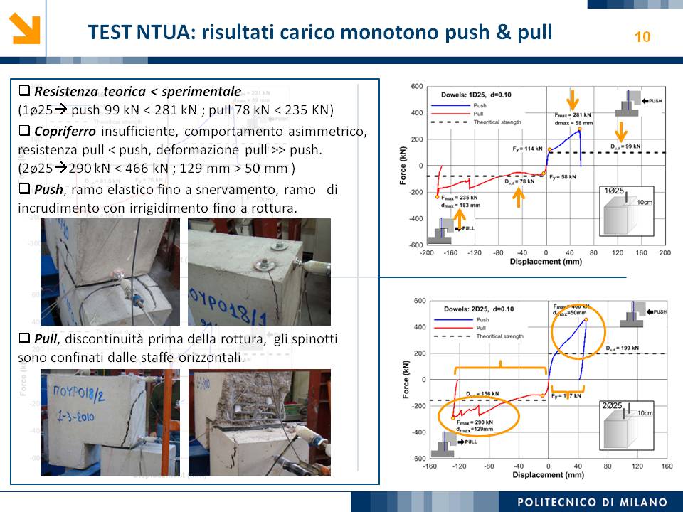 L’obiettivo dello studio presentato è qualificare e quantificare i parametri caratteristici del comportamento sismico, in termini di spostamento, resistenza, rigidezza e duttilità, delle connessioni a spinotto trave – colonna correntemente impiegate nelle strutture industriali prefabbricate. Queste connessioni sono tipicamente costituite da barre di acciaio ancorate nel pilastro e passanti in appositi alloggiamenti della trave, successivamente annegati con malta, in modo da garantire un comportamento pressoché a cerniera nel piano verticale e un comportamento rigido nel piano orizzontale. Nella tesi è riportata un’analisi parametrica relativa alle formulazioni attualmente presenti in letteratura per la valutazione della resistenza di tali connessioni, al fine di sottolineare pregi e difetti di ognuna. Viene inoltre presentata la procedura necessaria a caratterizzare il comportamento del collegamento in termini di forza-spostamento, sia a snervamento sia a rottura, mediante curva “Bi-Lineare” e “Tri-Lineare”. Tali procedure sono verificate attraverso una campagna sperimentale, realizzata nell’ambito del progetto di ricerca Europeo SAFECAST, di cui si riportano i set up delle prove e i risultati ottenuti per storie di carico sia monotono sia ciclico; i test sono stati condotti fino allo spostamento ultimo, in modo da determinare, in maniera dettagliata, la curva forza-spostamento caratterizzante la connessione. La definizione “Bi-Lineare” e “Tri-lineare” del comportamento del collegamento spinottato è stata applicata nella modellazione ad elementi finiti di due strutture prefabbricate monopiano ad uso industriale, simmetrica e non, realmente esistenti. Su tali strutture sono state condotte analisi dinamiche non lineari, Time History, al fine di evidenziare la differente risposta, da parte dell’edificio soggetto a sisma, tra l’innovativa modellazione della connessione spinottata con elementi “Beam Spring” e il classico vincolo a semplice cerniera, attualmente adottato nella comune pratica progettuale. Lo studio presentato cerca di colmare le lacune nella conoscenza del comportamento sismico delle connessioni spinottate trave-colonna, promuovendo lo sviluppo di strumenti numerici appropriati, attendibili e verificati sperimentalmente, da utilizzare nella progettazione di strutture prefabbricate in zone sismica sfruttando le proprietà delle stesse connessioni. Il software utilizzato per le modellazioni FEM e' il codice di calcolo Straus7. |