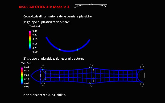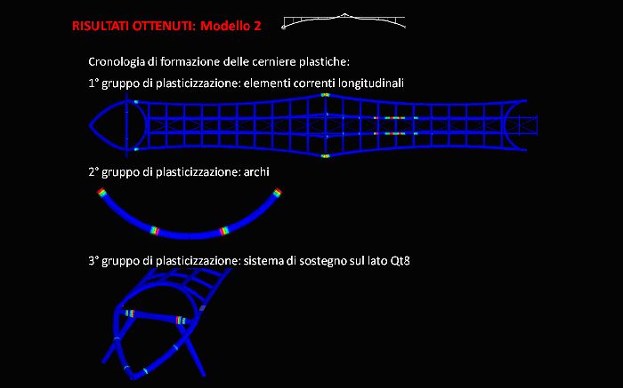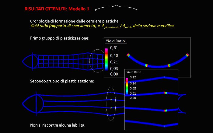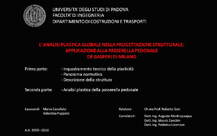 Alla luce delle più recenti normative nazionali ed europee, vengono introdotte ed analizzate le metodologie di calcolo plastico a rottura previste in sede normativa. In aggiunta ai più didattici metodi di calcolo rigido-plastico (metodo cinematico) ed elasto-plastico (metodo evolutivo) vengono introdotte le possibili analisi elasto-plastiche non-lineari incrementali, condotte per mezzo di codici di calcolo ad elementi finiti, ed applicate in particolare per sistemi strutturali a geometria complessa e forma non regolare. Lo studio è stato applicato al complesso metallico denominato “passerella De Gasperi” di Milano (Progettista Esecutivo dell’opera: società ARUP ITALIA S.R.L.), sistema di luce 60 m attualmente in realizzazione, di forma non regolare, indagando dapprima l’idoneità normativa per l’applicabilità del calcolo plastico globale secondo EN1993-2005 ed NTC2008, e procedendo poi all’estrazione degli effettivi moltiplicatori critici di collasso plastico. Le analisi numeriche sono state condotte per mezzo del codice FEM Straus7 solutore non-lineare per geometria e materiale, con specifici requisiti di accoppiamento assial-flessionale nella risposta del materiale e progressiva formazione di elasto-plasticità nella sezione. |