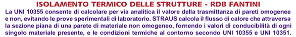 La normativa UNI 10355 consente di calcolare in maniera analitica il valore della trasmittanza di materiali omogenei e non, evitando le prove sperimentali di laboratorio sempre inficiate da variabili non controllabili, e da imprecisioni dovute ad errori di tipo strutturale e sistematico. Il programma STRAUS consente di calcolare il flusso di calore che attraversa una parete di materiale non omogeneo fornendo i valori di conducibilità di ogni singolo materiale presente e le condizioni termiche al contorno regolamentate dalla UNI 10355 e dalla UNI 10351 .
