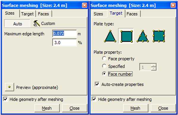 La semplicità del modello geometrico importato non richiede alcuna particolare cura in relazione alla compatibilità tra facce adiacenti. Si passa direttamente alla generazione automatica della mesh sulle superfici importate. La seguente figura illustra i parametri rilevanti per la generazione suddetta.