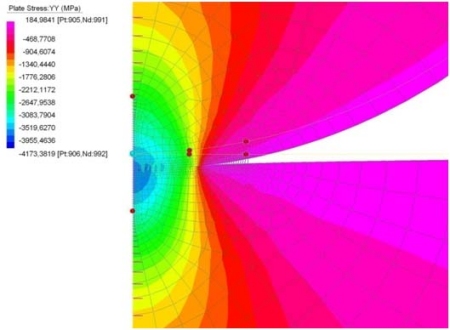Si sono confrontate le tensioni di von Mises sulla configurazione deformata con il comportamento reale delle cave a rottura, ottenendo il risultato illustrato dalle figure 8 e 9.