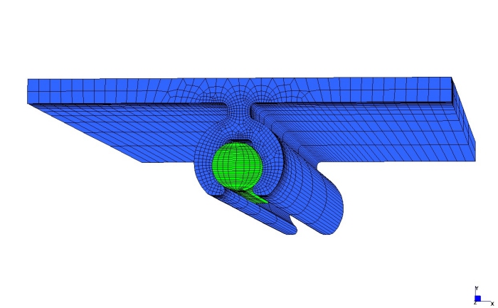 Come ultima serie di analisi si è modellato un giunto completo, utilizzando una combinazione di elementi Brick e Shell sfruttandone le simmetrie (fig. 13), in modo da diminuire il più possibile i tempi di calcolo.