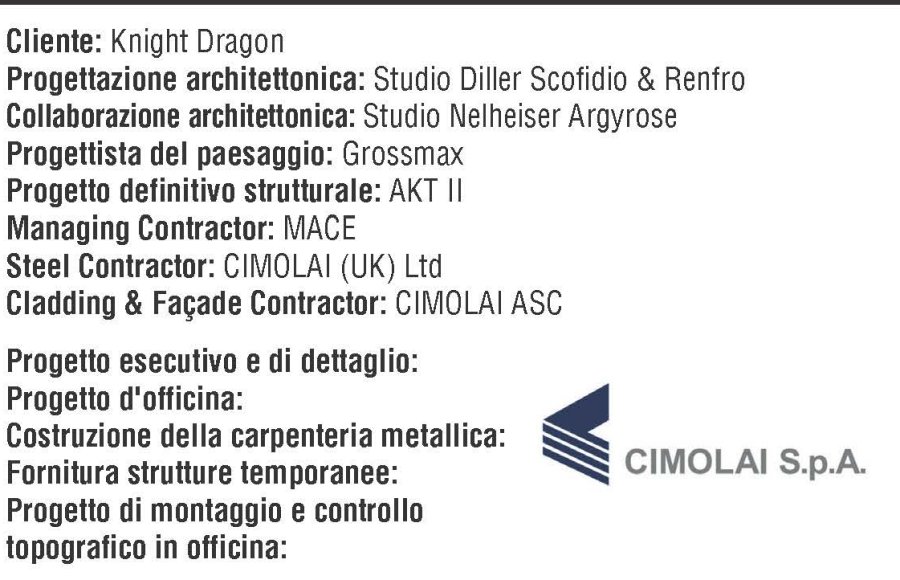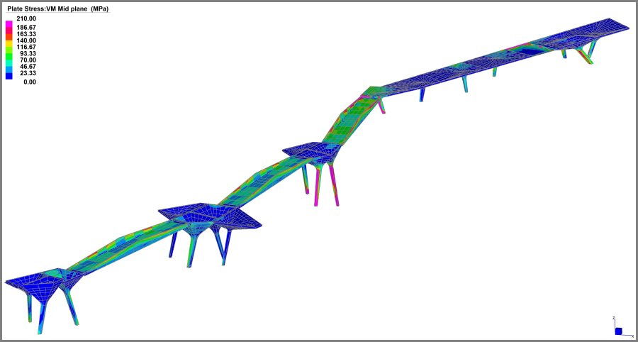 La Cimolai Spa ha realizzato le complesse strutture portanti in acciaio ed il rivestimento con finitura in vetro della avveniristica passerella sopraelevata chiamata THE TIDE. Ideata dallo studio di architettura Diller Scofidio & Renfro e' situata nella Greenwich Peninsula di Londra. Essa ospita un giardino pensile che trasmette ai visitatori un senso di calma e armonia con la vista di alberi, panorami e opere artistiche. La struttura e' composta da ventotto distinte piattaforme in acciaio realizzate con superfici curve e sostenute da snelle colonne. Cinque sono i complessi strutturali principali chiamati "Isole". Esse determinano il percorso del giardino attraverso ponti pedonali di collegamento integrati da scale, rampe e ascensori di accesso. Cimolai Spa ha sfruttato la flessibilita' del codice strutturale a elementi finiti Straus7 mettendo in comunicazione i modelli FEM delle singole isole con l'utilizzo combinato delle condizioni al contorno. In ragione della estrema complessita' delle geometrie, il modello e' stato sviluppato completamente mediante l'utilizzo di elementi plate. La campagna di analisi strutturali svolte ha compreso sia quello di tipo statico-non lineare, per rappresentare la risposta elasto-plastica del materiale, che quelle di buckling lineare, per individuare i fenomeni di instabilita' locale dei pannelli curvi e provvedere i necessari irrigidimenti.