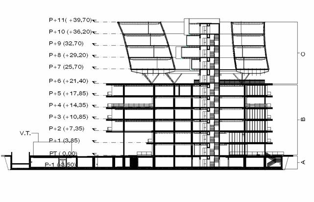 Con la simbologia di figura si individuerà con la lettera “A” la parte di edificio interrata, con la lettera “B” la parte di edificio fuori terra fino al piano 6° (+21,40) e con la lettera “C” la parte relativa agli ultimi 5 solai.