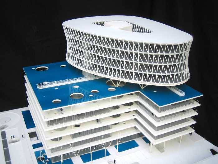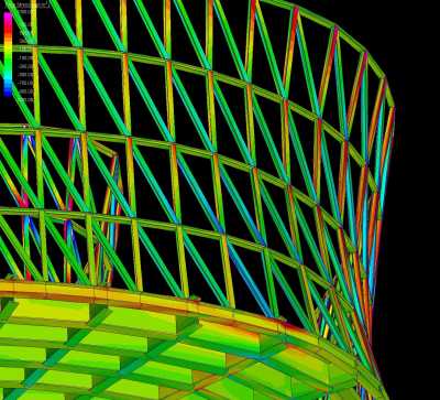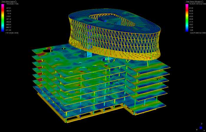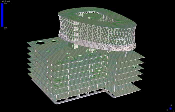 La struttura del corpo “C” è sostanzialmente in acciaio e presenta un piano di trasferimento dei carichi verticali alle sottostanti strutture posto a quota +25,70 dalla quale si diparte una struttura reticolare perimetrale a cui si appoggiano le travi dei solai dei piani superiori. I solai di detto corpo sono da realizzarsi in acciaio (travi IPE400 + soletta collaborante in cls gettata su lamiera Hi-bond)