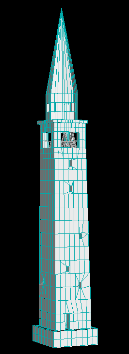 Per lo studio degli effetti delle forze orizzontali dovute all’oscillazione delle campane è stato realizzato un modello agli elementi finiti tridimensionale del campanile con elementi Brick simulanti la muratura e con elementi Beam rappresentanti la struttura in legno che sorregge le campane stesse.
