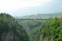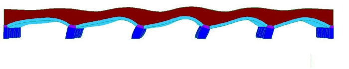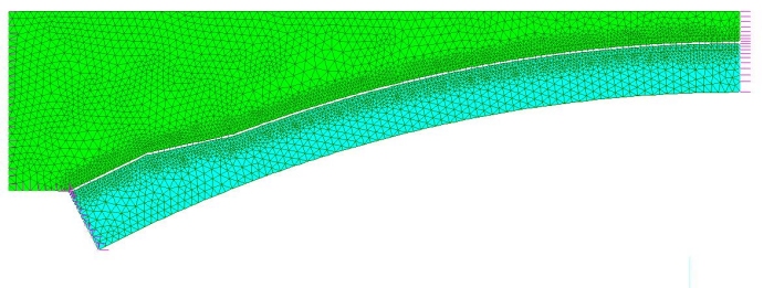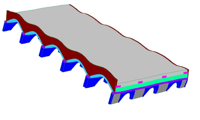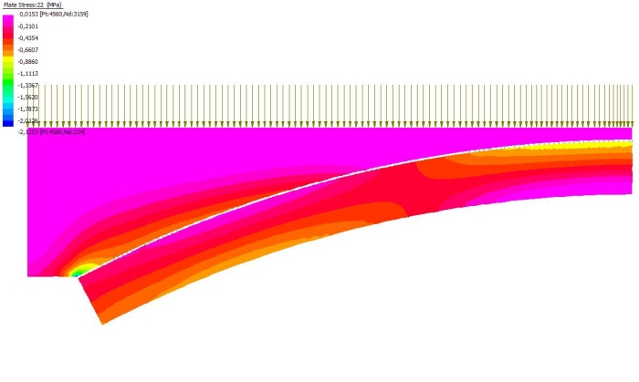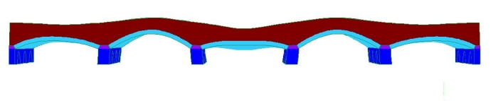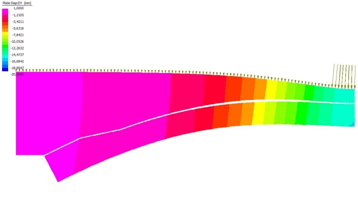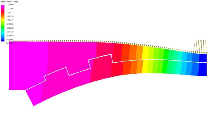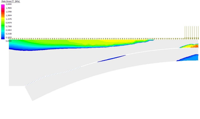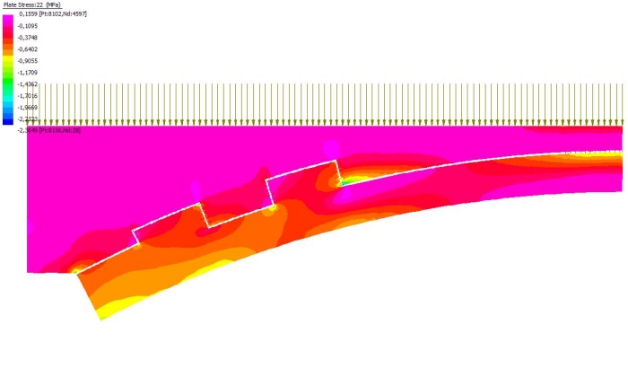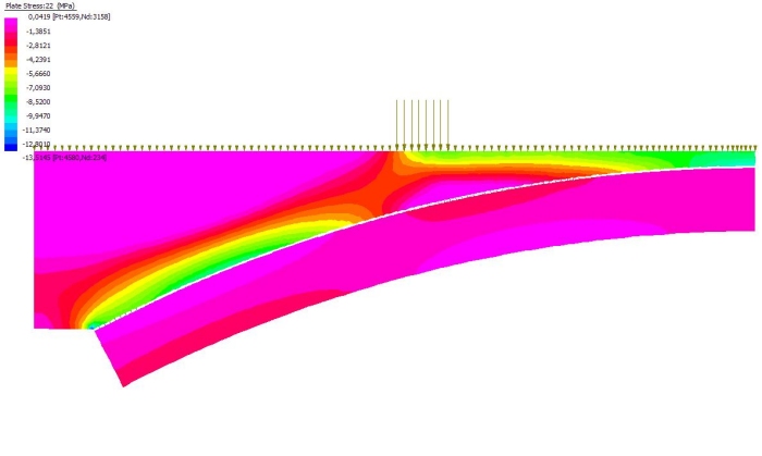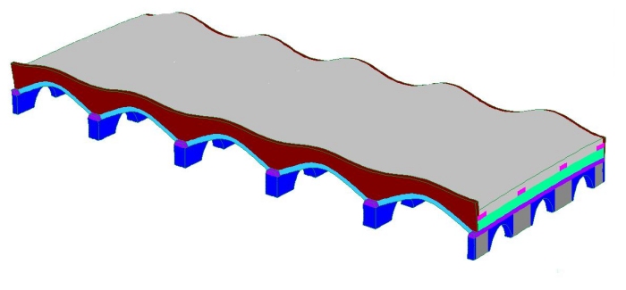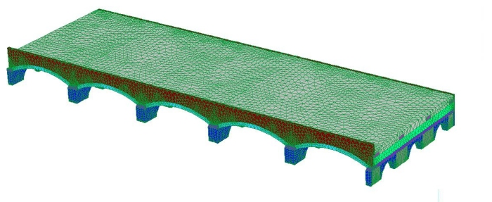 L’analisi dell’aspetto più particolare e forse interessante del ponte è rappresentata dallo studio della collaborazione tra l’arco in muratura e la nervatura in calcestruzzo presente sopra lo stesso (Figura 1), agevolata dalla presenza di due denti in muratura. Con il software Straus7 è stato creato un modello ad elementi plate ed elementi beam di tipo point contact (Figure 2 e 3), con cui è stata effettuata un’analisi quasi-statica volta a studiare il meccanismo sottoposto ai fenomeni lenti di ritiro e viscosità differita, eseguendo il confronto tra due differenti modelli ad elementi finiti (Figura 4). In secondo luogo è stata eseguita un’analisi non-lineare con i carichi previsti dalle NTC 2008 (Figura 5), confrontando infine i risultati con un terzo modello più affinato (Figure 6 e 7).