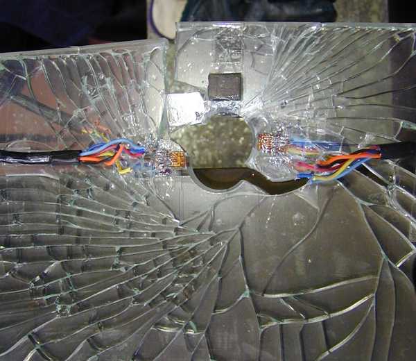 Scopo di tali prove è quello di determinare il valore di rottura per trazione di una lastra di vetro forata. Dato che il carico ultimo di collasso risulta fortemente influenzato dalla distanza del foro dall’estremità della lastra, sono stati testati provini con fori posizionati a differenti distanze dal bordo (2, 3, 4, 5 e 10 diametri dal bordo). Per ottenere valori attendibili del carico di rottura, mettendo in conto dell’ampia dispersione dei valori che si possono ottenere in tale tipologie di prove, è stato necessario effettuare più tests per ogni tipo di lastra (fig. 2, 3 e 4).