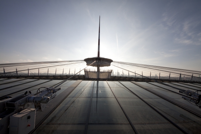 Il nuovo stadio nazionale di Varsavia ha una capienza di 55.000 posti a sedere. La copertura, del peso complessivo di 15.000 tonnellate, e' una tensostruttura sull'intera superficie, completamente ancorata dall'esterno mediante un meccanismo a sviluppo circolare formato da 72 colonne (profilo CHS 1016mm x 30-70mm) disposte in pianta lungo una circonferenza di 300 metri di diametro, un anello di contrasto detto compression ring (profilo CHS 1820mm x 80mm), pennoni di appensione dei cavi, detti inclined struts (profilo CHS da 1200 a 600mm x 35-45mm), contrasti di ancoraggio esterno, detti facade tie (profilo CHS 508mm x 20-50mm). La copertura vera e propria e' realizzata mediante un doppio ordine di cavi radiali (72 superiori di diametro 70-140mm e 72 inferiori di diametro 70-150mm) che, partendo dal perimetro esterno della struttura, convergono verso il centro e si ancorano sul mozzo centrale, detto centerspire. Il centerspire e' sospeso sulla verticale di centrocampo, ha una sezione tubolare di dimensione variabile da 1600x25mm a 300x5mm, ha un'altezza di 70m e pesa 200t. Lungo il fusto del centerspire sono ancorati il cosiddetto garage ed il video cube. Il garage e' la struttura a forma di pagoda circolare che contiene la membrana retraibile di copertura, movimentata da quattro argani quando il tetto e' in posizione chiusa. Il video cube e' la struttura di supporto dei maxischermi. E' costituito da 4 bracci reticolari disposti a croce. Ciascun braccio sostiene uno schermo del peso di 8t. |