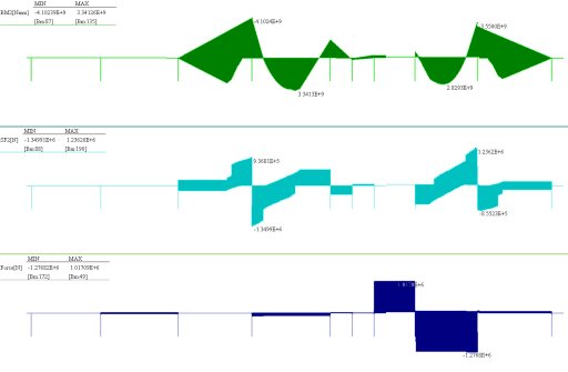 Una analisi bidimensionale con un modello basato su elementi beam è stata utilizzata per identificare la sezione critica della trave da analizzare. Le forze nodali rappresentanti i carichi delle ruote sono state poste nelle diverse posizioni che assumono le ruote per determinare i valori di progetto inviluppo dei momenti flettenti e delle forze di taglio. Il generatore di inviluppi di casi di carico di Straus7 è stato usato per rappresentare i diagrammi di momenti e tagli lungo l'asse della trave generati dal movimento del carrello.